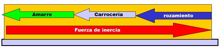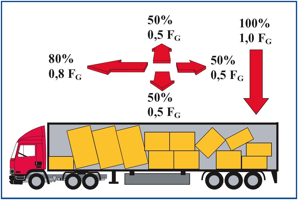 A força de inércia é devida à inércia durante o transporte, provocando deslocações laterais para a frente ou para trás. Se a carga se deslocasse, a força provocaria um movimento que faria com que o peso da carga fosse muito superior ao seu peso real. Para determinar o peso da carga num momento em que actua a força de inércia (colisão, travagem, aceleração, etc.), é necessário efetuar o seguinte cálculo: